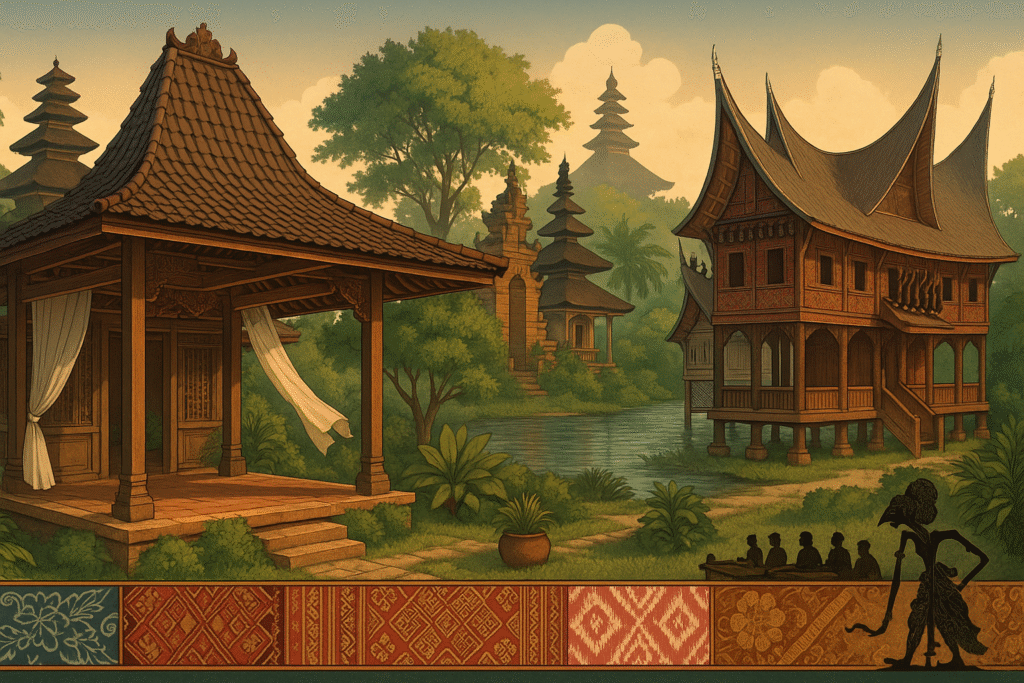 Seni rupa berjalan seiring inovasi konstruksi. Motif batik—parang, kawung, atau lereng—terkristalisasi dari tata nilai dan pengamatan alam. Songket Sumatra menonjolkan kilau benang logam yang menyinari ruang upacara. Tenun ikat Nusa Tenggara memanfaatkan pewarna alami seperti indigofera dan mengkudu; teknik pengikatan benang menghasilkan geometri organik yang berdenyut. Ukiran Jepara dan Toraja menambah lapisan visual pada elemen arsitektur—lisplang, balok, tiang—sekaligus menyisipkan makna kosmologis.